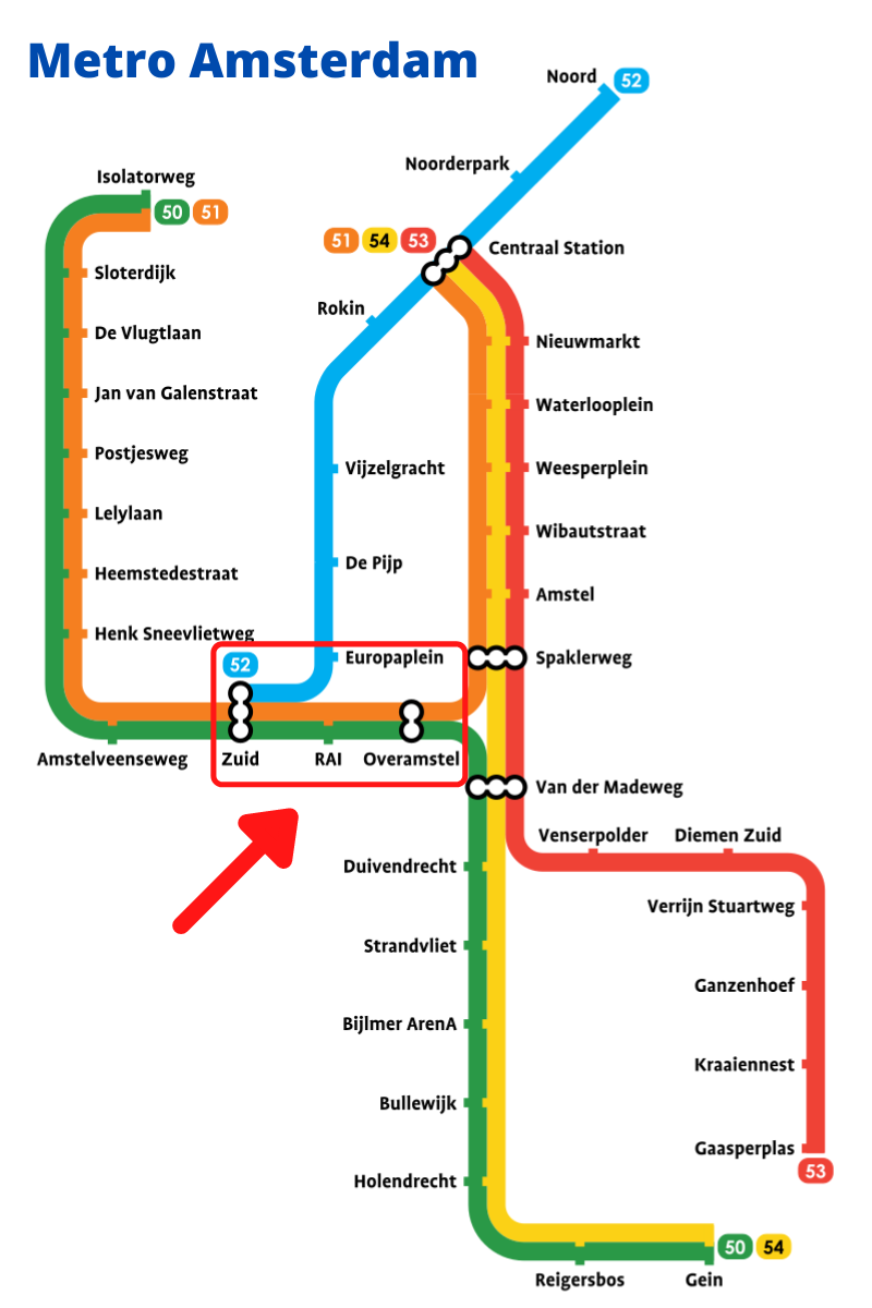 From Amstel Station, you can reach the RAI with metro 51 (get off at Amsterdam RAI station) or bus lines 62 (get off at Europaplein) or 65 (get off at Scheldeplein).